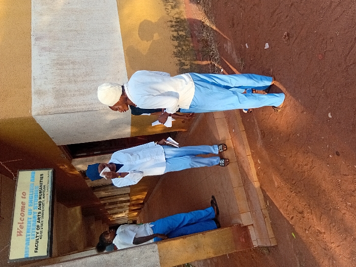 Three people wearing blue pants and white tops stand outside a building. A sign reads "Welcome to Department of English and Faculty of Arts and Humanities, Kogi State University, Anyigba". The person in the middle holds a tissue. One person has a white kufi. The scene is illuminated by sunlight, casting shadows on the ground. The ground is reddish-brown.
