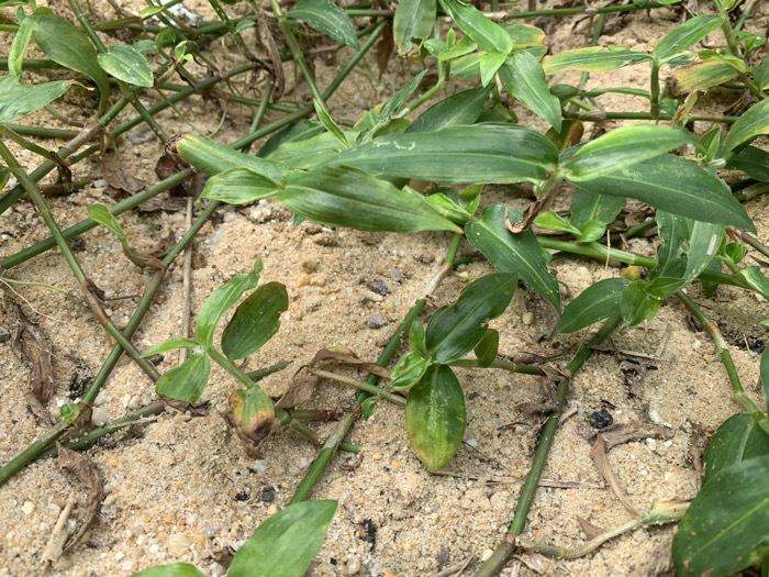 The image displays a close-up, ground-level view of a natural environment in the city of Ikot Mbonde, Nigeria. The terrain consists primarily of light brown to yellowish sand, mixed with scattered small white and dark pebbles. Interspersed throughout the sandy substrate is dense, herbaceous groundcover. This vegetation is characterized by numerous slender, green and greenish-brown creeping stems that spread horizontally across the surface. Attached to these stems are oval to lanceolate-shaped leaves, predominantly vibrant green, with some exhibiting areas of yellowing, browning, or minor superficial damage. No individuals, animals, or manufactured objects are present in the frame, and no actions or interactions are depicted.