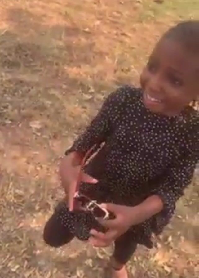 A young girl, around preschool age, smiles at the camera. She has dark skin, dark eyes, and her hair is braided into neat rows. She's wearing a black, long-sleeved dress with small white polka dots, black leggings, and sandals. She is holding something small and white in her hands. The background is a grassy area with scattered brown leaves. A person wearing black pants and black shoes walks into the frame and the girl reaches for them.