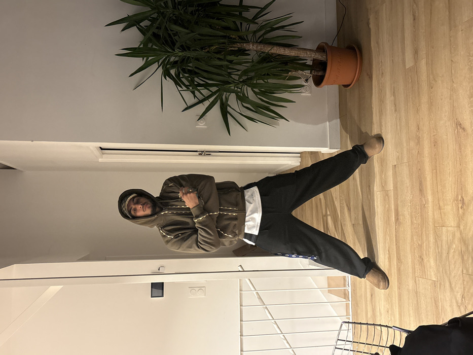 An adult male stands centrally in an indoor residential space, likely a hallway or entryway, in Saint-Denis, France