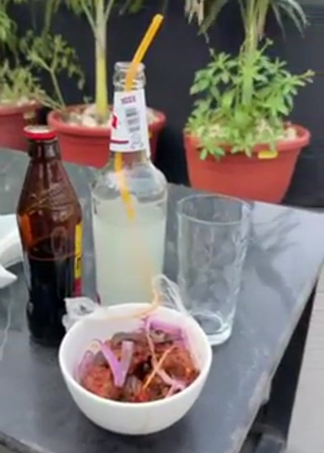 A video shows a table with food and drinks on a rooftop patio with two women walking around. The table has a bottle of dark liquid, a bottle of clear liquid with a yellow straw, a glass, a bowl of food with red onion, and a small white plate. In the background are potted plants and a metal railing. The women enter the frame; one is wearing a white dress and the other a pink outfit. They walk behind a speaker and seem to be looking at something on the ground. The woman in the white dress briefly bends down to look at something.