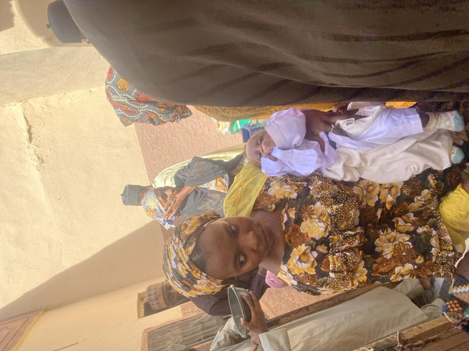 The image depicts an outdoor or semi-enclosed courtyard scene in the city of Chiranchi, Nigeria, under bright sunlight which casts sharp shadows on a light tan-colored wall. In the immediate foreground, a young adult female, approximately 20-30 years old, with dark skin, is prominently featured. She wears a multi-colored headwrap and a long-sleeved dress with a brown, yellow, and white floral pattern and a ruffled bodice. She holds an infant, approximately 0-6 months old, dressed in white clothing with light blue booties, whose face is partially obscured by white fabric or its own hand. The woman's gaze is directed slightly to her right. Behind and to the left of the central woman, a male adult, partially visible, wears a dark brown garment and a patterned cap, holding a dark, round bowl in his left hand. Further in the background, to the right, an older female adult with dark skin is present, wearing a dark head covering and a patterned garment, with one hand raised near her face. Other individuals are partially visible in the midground and background, wearing traditional attire including head coverings and caps, suggesting a gathering. The ground beneath the central figures shows a patterned textile or mat.