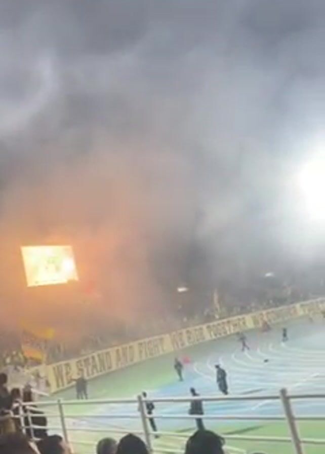 soccer match in a crowded stadium filled with smoke. There is a bright flare burning in the stands and the field is surrounded by a track. The sky is overcast. Players in yellow and orange uniforms are on the field, and there are other individuals in black standing along the sidelines. A bench with red seats is also visible. A sign reads "We stand and fight. We ride together. We conquer together". The camera pans to show the breadth of the crowd.