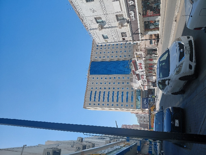 The image depicts an urban street scene in Makkah Al Mukarramah, Saudi Arabia, under a clear, bright blue sky. In the foreground, a dark vertical pole partially obstructs the left side of the frame. Two sedans are parked parallel to the curb on the right side of a paved road: a black vehicle (possibly a Toyota) to the left, and a white Nissan sedan to its right, displaying a Saudi license plate with Arabic script and numerals. A portion of a third white vehicle is visible in the bottom right corner. The street is lined on both sides with multi-story buildings. On the left, a light-colored building shows several external air conditioning units. On the right, a row of commercial buildings features various storefronts with Arabic signage, displaying clothing and other goods. These buildings are predominantly light-colored with decorative elements. In the mid-ground, a prominent, taller building dominates the center-right, characterized by a light-beige facade with a grid pattern of numerous small, square dark windows. A significant vertical section on its right side is clad in blue reflective glass. Below this building, more storefronts are visible. Further down the street, a yellow bus is discernible on the road, and at least one individual is visible walking. The overall impression is that of a bustling commercial district during daylight hours.