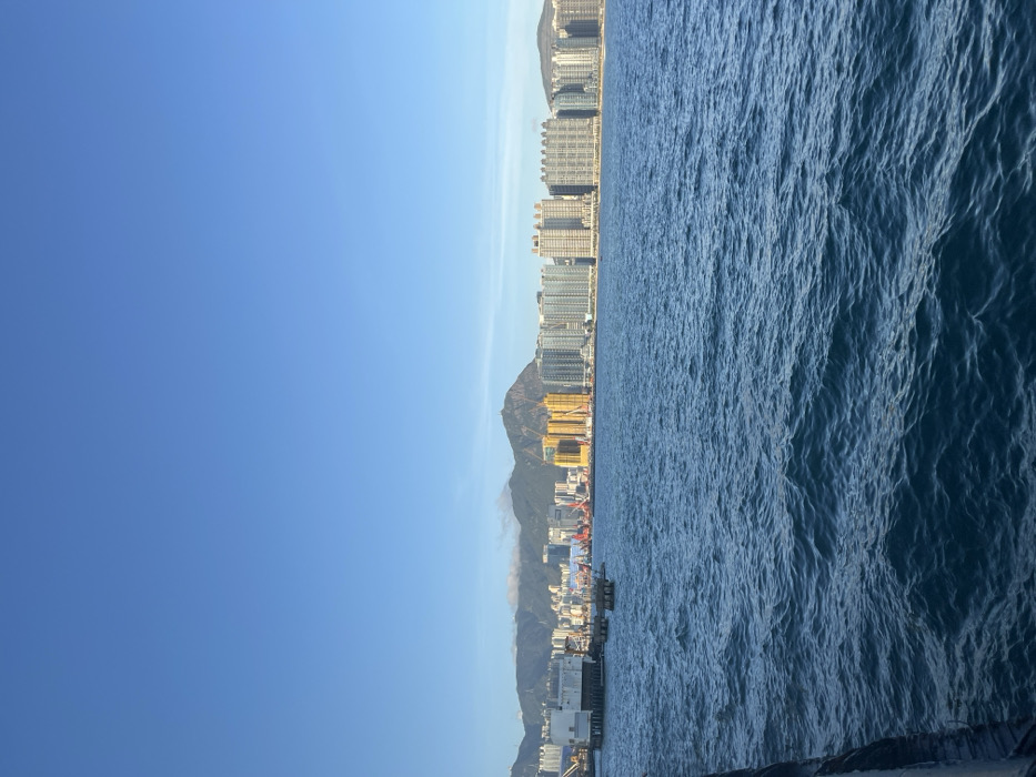 The image displays a panoramic view of Hong Kong's eastern coastline, observed from Victoria Harbour within the city of Kowloon, encompassing parts of the Kwun Tong district and extending towards the adjacent Tseung Kwan O area. The scene is dominated by a clear, bright blue sky in the upper half, with a vast expanse of dark blue-green water featuring moderate surface waves occupying the lower half. A dark, non-specific structure, likely part of a vessel or platform, is partially visible in the bottom-left foreground, submerged in the water. Along the distant shoreline, a dense urban and industrial landscape unfolds from left to right. On the far left, large, white, block-like industrial structures or piers extend into the water, supported by pilings. Behind these, clusters of grey and white high-rise buildings are visible, interspersed with multiple red and white cranes, indicative of active construction or port operations. Progressing right, a prominent group of several tall residential buildings with distinctive bright yellow facades stands out. To their right, a continuous stretch of modern, beige and grey high-rise residential towers lines the waterfront, many featuring visible balconies. Behind the urban development, a range of green, undulating mountains forms the horizon, with minor wisps of cloud clinging to some peaks on the left side. No individuals or specific actions are discernible.