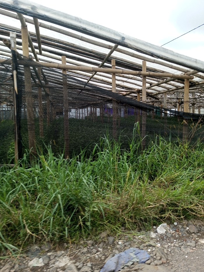 The image depicts an exterior view of an agricultural cultivation structure located in Vieng Phouka, Laos. The primary subject is a large, open-sided building constructed with a framework of bamboo poles supporting a partial roof covering of translucent plastic sheeting. The sides of the structure are enclosed by dark, fine mesh netting, extending from the roofline downwards. Visible through the netting and open sections is a dense, uniform field of small, green, leafy plants, indicative of a nursery or crop cultivation. In the foreground, an unpaved strip of ground features abundant growth of tall, green wild grasses and weeds, partially obscuring the lower section of the netting. Beneath the vegetation, the ground is uneven, composed of dirt and scattered small stones. Minor debris is present on the ground, including a crumpled piece of blue or grey fabric/plastic in the lower right quadrant and several small white fragments, possibly plastic, closer to the center. The sky overhead is overcast or uniformly light, suggesting diffused natural lighting. No individuals or discernible actions are present within the frame.