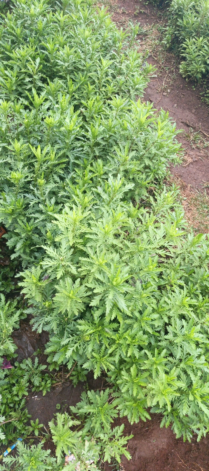 A dense patch of green leafy plants covers most of the frame. The plants have serrated, feathery leaves and appear to be closely packed together. A small area of reddish-brown soil is visible on the right and lower edges. The plants dominate the foreground, with some of them reaching a substantial size. The scene appears to be a close-up shot of vegetation growing in a garden or natural setting.