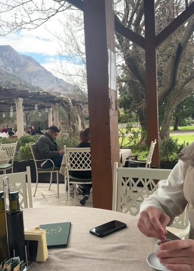 n outdoor patio cafe with a man stirring coffee at a table in the foreground. The table is covered with a linen cloth, holding a phone, napkin dispenser, and the cafe's menu. Other patrons are seated at tables behind him, and a waiter approaches a table. The cafe has white lattice chairs and brown wooden support beams. A pergola structure is also visible in the background, framing the mountain landscape in the distance. The sky is cloudy with patches of blue.