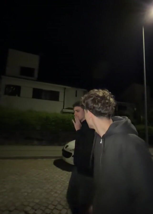 Two young men are walking on a cobblestone street at night. One is wearing a black hooded sweatshirt and has curly light brown hair. He turns to the camera and smiles. The other man is wearing a black sweatshirt and is slightly behind him. A white car and a building can be seen in the background. A streetlight illuminates the scene.