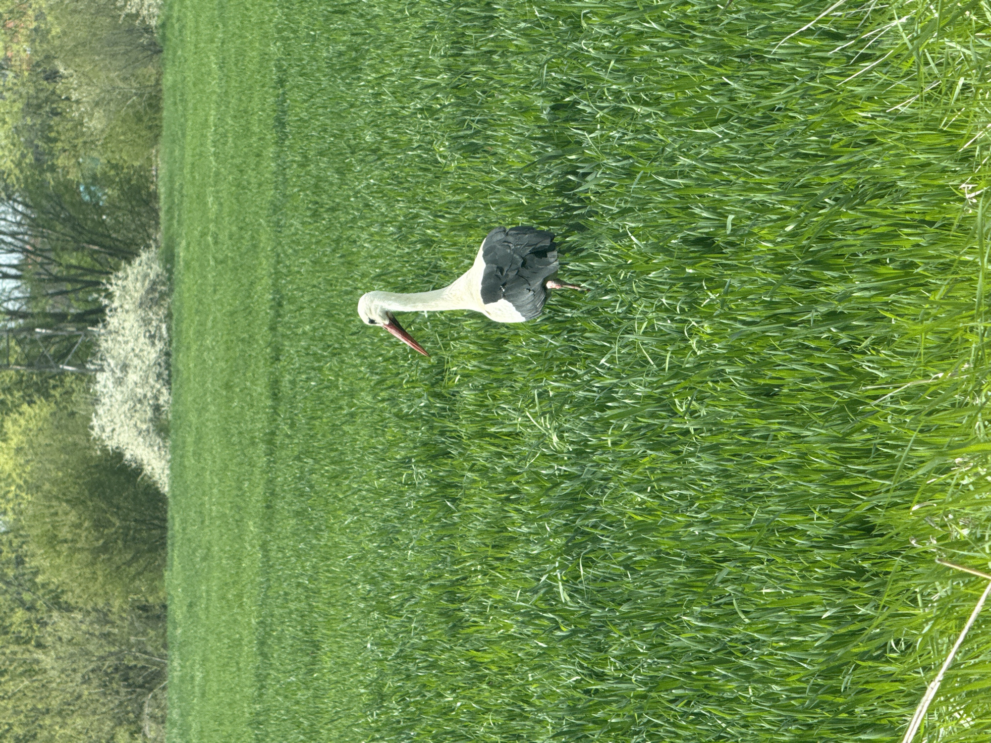 - "A solitary white stork with black wings and a red beak stands in a field of lush green grass" by FM-s19923, licensed under CC BY 4.0