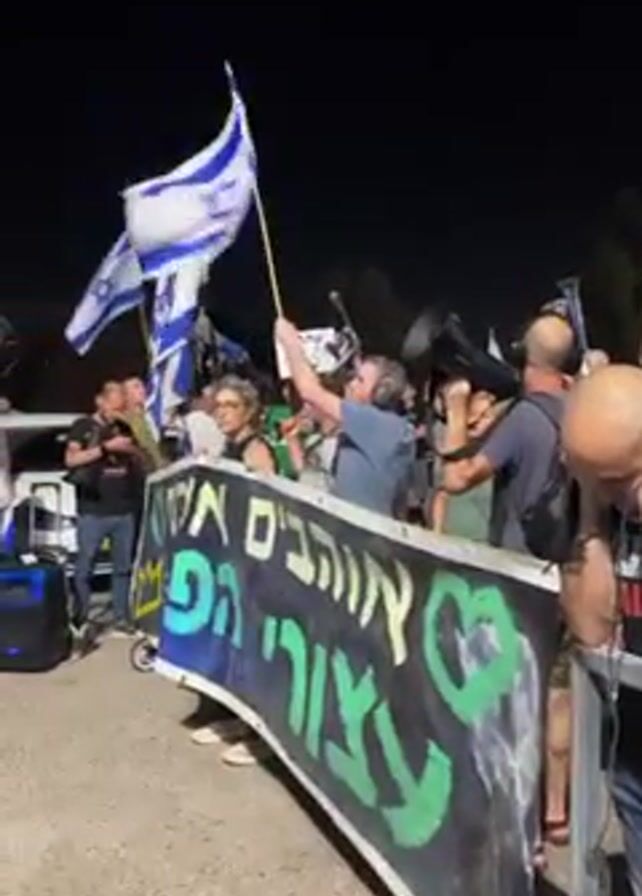 group of people protesting at night. They are holding Israeli flags and a large banner with Hebrew writing. Some people are using megaphones. The crowd appears to be behind a metal barricade. The overall atmosphere seems intense and political.