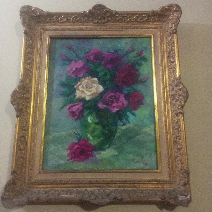 A framed oil painting depicts a floral arrangement