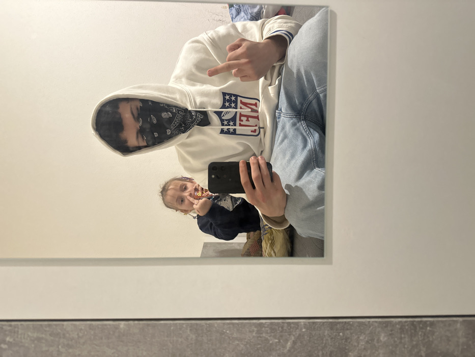 A mirror reflects a selfie of a person wearing a white hoodie with an NFL logo, blue jeans, and a black bandana covering part of their face
