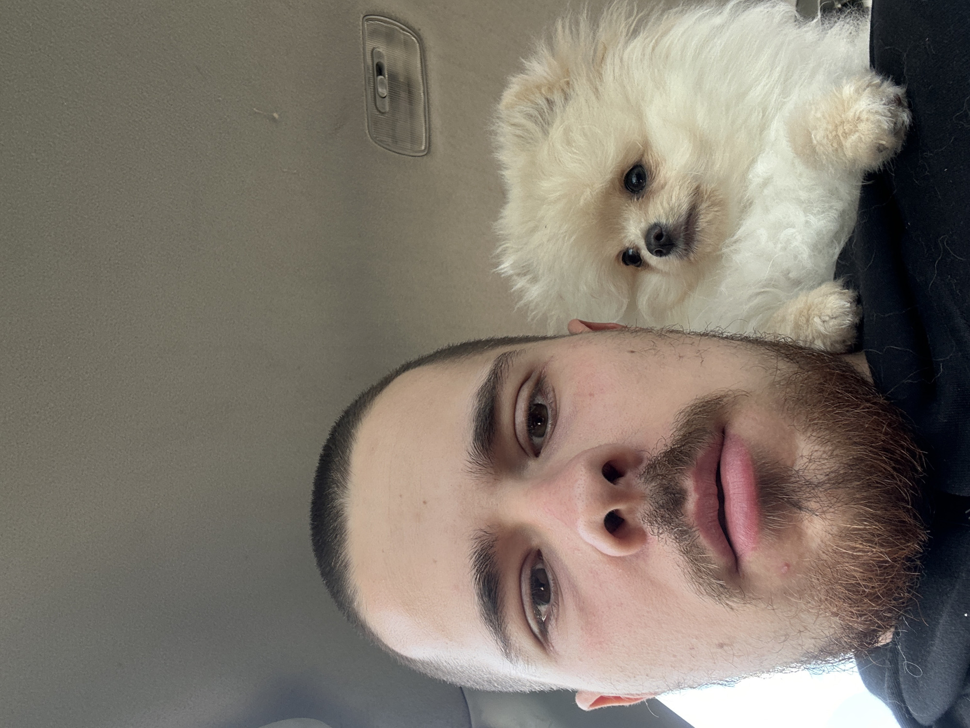 A man and a small, white, fluffy dog are in the passenger seat of a car. The man has short dark hair, brown eyes, and a beard. He is looking directly at the camera, positioned below his face. The dog is perched on his shoulder, also looking at the camera. The car's interior is visible, including the ceiling and a dome light. The location is unknown.