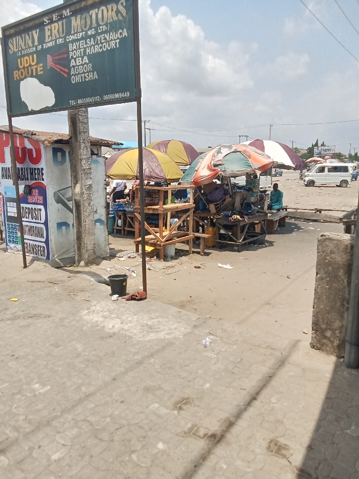 street scene in Ovwian, Nigeria, located at coordinates 5.496 latitude and 5.797 longitude. The scene appears to be in front of a business called "Sunny Eru Motors," which is a division of Sunny Eru Concept Nig. Ltd. The business services the following areas: Bayelsa/Yenagca, Port Harcourt, Aba, Agbor, Onitsha. There are several small businesses selling items under umbrellas on the side of the road. There is one person visible, wearing a light-colored shirt and dark pants, standing behind a stall under an umbrella. Several objects can be seen, including a black bucket, a small table with a black cloth, and a sign advertising services. The scene is mostly paved. The weather appears to be sunny and dry. The scene suggests that this is an everyday sight in Ovwian. The street is narrow and appears to be a busy area.