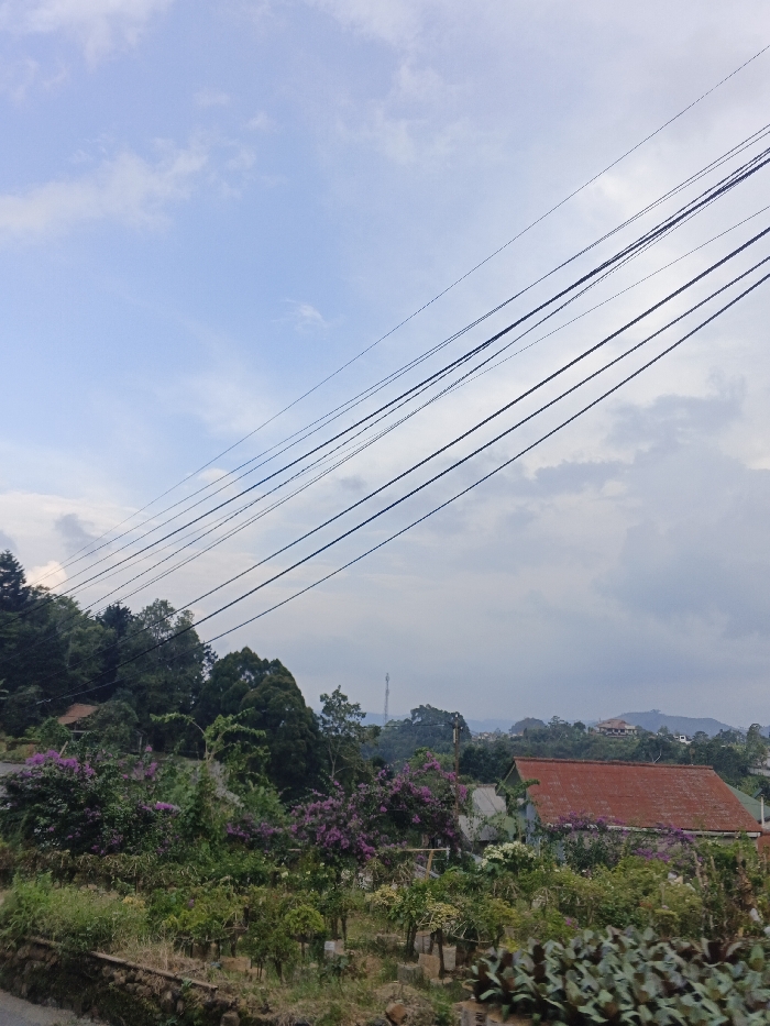 The image displays a panoramic view of a residential and natural landscape within the Mate Yehuda Regional Council, Israel, under a partly cloudy sky. Multiple dark power lines diagonally traverse the upper half of the frame from upper left to middle right. Below the power lines, a series of hills are covered with dense green trees and various foliage. In the middle ground, vibrant purple flowering bushes, consistent with bougainvillea, are prominent amidst other greenery. A single-story building with a distinct red-tiled roof and light-colored walls is situated in the lower right quadrant. Adjacent to and in front of this building, an area featuring structured cultivation or a garden with smaller plants and exposed soil is visible. In the distant background, atop a hill, a tall, slender grey communication tower is discernible, along with other scattered residential structures. No individuals, explicit actions, or interactions are present in the scene. The lighting suggests daytime. A dark, narrow strip, possibly a road or path, is partially visible along the lower left edge.