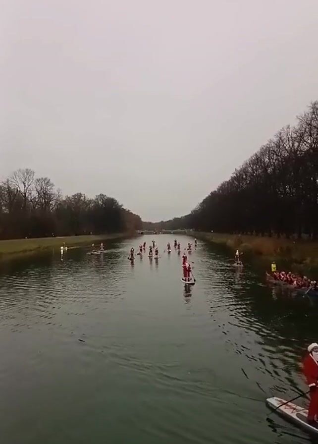 calm river lined by trees on either side, where several people dressed as Santa Claus are paddleboarding. The sky is overcast, and the overall scene suggests a chilly or late-autumn day. The river appears to be relatively wide, allowing ample space for the paddleboarders. At the far end of the river, there is a bridge spanning across. Along the right bank of the river, a long rowboat is filled with people. One of the Santas is at the forefront of the video, paddleboarding towards the camera.
