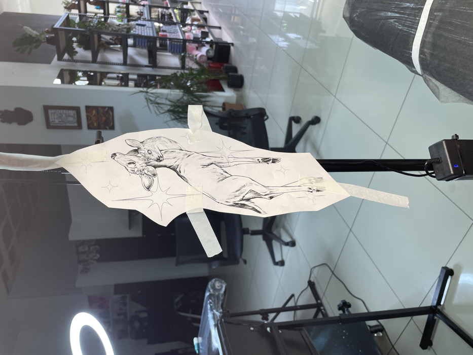 An interior photograph shows a tattoo studio located in Rostov-on-Don, Russia. Centrally, a white paper sheet with a monochrome drawing of two deer-like animals, accompanied by small starburst designs, is taped to a black metal stand. A small black rectangular electronic device with a blue indicator light is attached to the lower portion of this stand. To the left, a portion of a black adjustable metal table, covered with clear plastic sheeting, is visible. An illuminated circular white ring light on a separate stand is also present on the left. In the background, two black wheeled office chairs are positioned on a light-colored tiled floor with visible grout lines. The right side of the background features a multi-tiered black metal shelving unit displaying various bottles and containers, with several potted plants situated nearby. Two dark-framed artworks hang on a light-colored wall. No individuals are present in the scene.