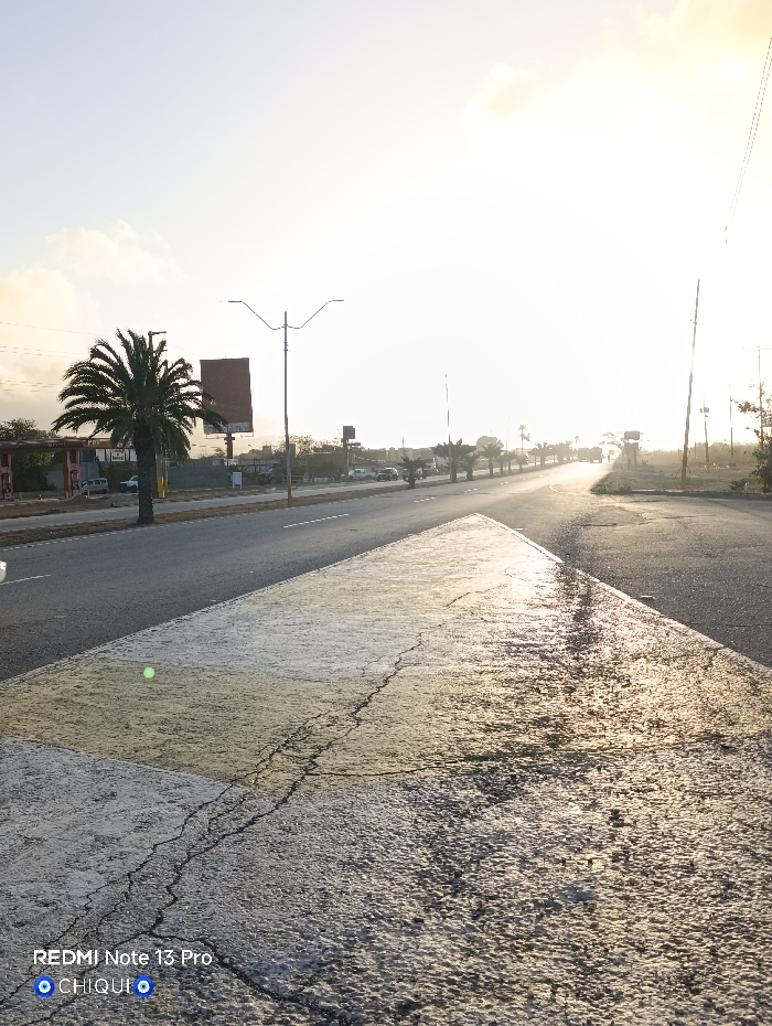The image displays a wide-angle, low-perspective view of a multi-lane paved road in El Dátil, Venezuela, under bright, low-angle sunlight, consistent with morning or late afternoon. The sun's glare emanates strongly from the upper right, overexposing parts of the sky and road. In the immediate foreground, a cracked, light-colored paved surface, marked with white and yellow paint, forms a triangular pattern. A subtle green-yellow circular artifact is present on this surface in the lower-left quadrant. The paved road extends into the distant background, bordered by a median strip featuring multiple palm trees and modern Y-shaped streetlights. On the left side of the road, beyond the median, several structures, additional palm trees, and a large rectangular billboard are visible. Vehicles are present in the far distance on the road, indicating active traffic. The right side of the road features a less defined shoulder with dry, sparse vegetation. The sky is predominantly bright and overexposed, with diffused cloud formations visible, particularly towards the left. No individuals are discernible within the scene. A "REDMI Note 13 Pro" and "CHIQUI" watermark is located at the bottom left.