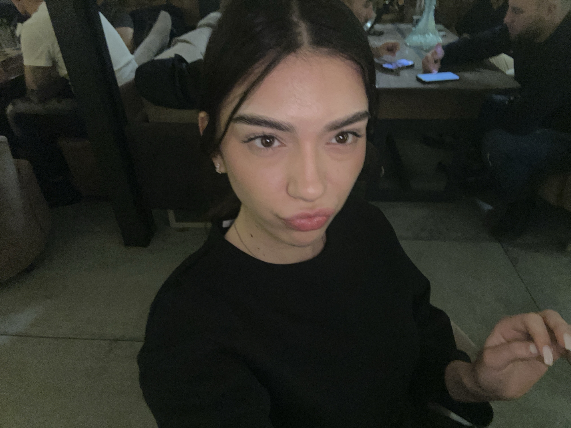 The image is a selfie of a young woman with dark hair pulled back from her face. She is wearing a black top and has a slight pouting expression. The background is blurred, but it appears she is in a restaurant or bar. A wooden table with multiple people around it is visible. Some people are using cell phones. Based on the location of Sofia, Bulgaria, it is likely the picture was taken there but the exact location is undeterminable.