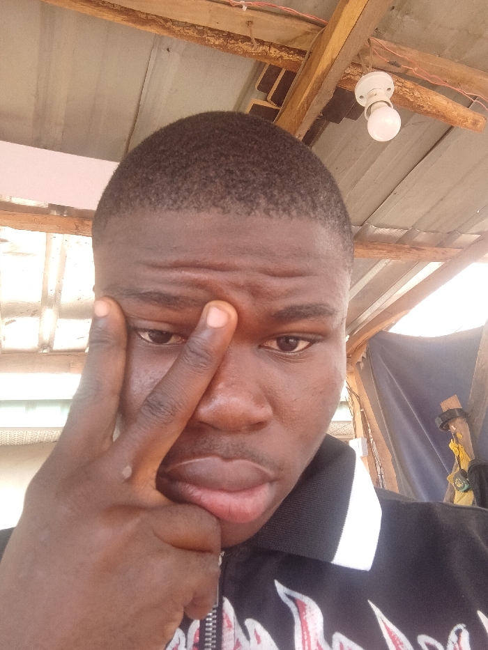 A close-up photograph captures a dark-skinned individual, appearing male, with a closely cropped hairstyle, looking forward