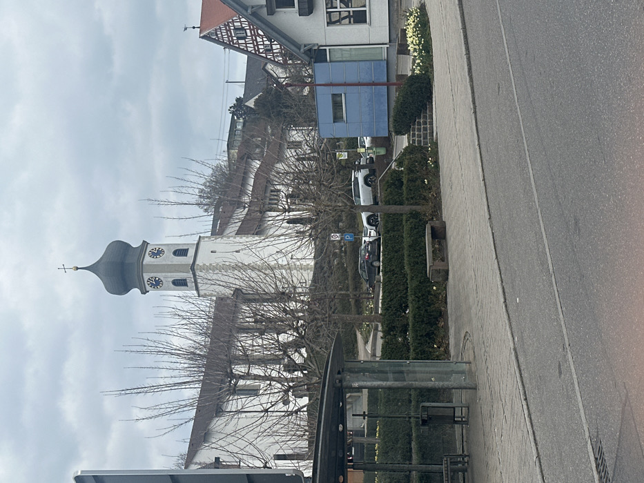 The image depicts a street scene in Krauchenwies, Germany, under an overcast sky