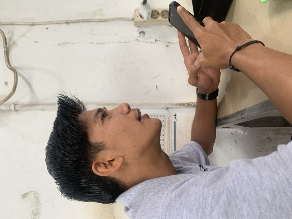 An adult male is depicted in a profile view, facing right, within an indoor setting in Lhokseumawe, Indonesia