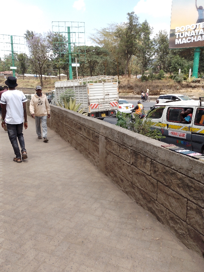 The image depicts an outdoor urban scene in the City of London ward, Kenya, under bright daylight. In the foreground, a light-colored paved pedestrian walkway extends diagonally from the lower left. Adjacent to the right edge of the walkway, a textured concrete retaining wall, molded to resemble stacked stone blocks, separates the pedestrian area from a lower-lying road. Two adult males walk away from the camera on the walkway. The man in the immediate foreground wears a black bucket hat, a white short-sleeved t-shirt with black arm stripes, dark jeans, and brown sandals. The man behind him wears a light beige hooded sweatshirt with a dark graphic on the chest, light gray trousers, and dark shoes. On the road below the wall, several vehicles are visible. A large white cargo truck with a slatted or caged bed, displaying red and white reflective hazard stripes on its rear, is positioned centrally, facing away. It appears to be carrying green produce. Behind the truck, a white sedan is partially visible. Further to the right, a motorcyclist wearing an orange safety vest is present on the road, alongside another motorcycle or scooter with two occupants. A white and yellow public transport van (matatu) with "KENWAY LUXURY" printed on its side is stopped or parked on the far right of the road. Multiple individuals are visible inside the matatu, with at least one occupant in a blue shirt visible through an open window. Colorful flat objects, resembling books or magazines, are arranged on the top edge of the concrete wall near the matatu. The background features a densely vegetated, hilly landscape with numerous trees, some exhibiting purple blossoms. Three large green metal billboard structures are present: two empty frames on the left, partially obscured by foliage, and one on the far right displaying an advertisement with the partial text "POPOTE TUNATA MACHANI" and an image of a person with raised arms. The sky above is bright and shows some scattered clouds.
