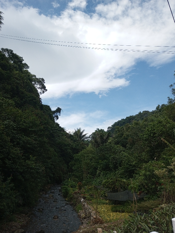 The image displays a verdant, mountainous valley environment in Ariyalai, Sri Lanka, under a partly cloudy sky. A narrow, rocky stream traverses the valley floor from the background towards the foreground, occupying the lower-left portion of the frame. Steep, densely forested hillsides, covered in lush green foliage, rise on both sides of the stream. In the upper-middle section of the sky, two sets of parallel utility lines are visible, extending horizontally across the frame. Along the right bank of the stream, a low retaining wall constructed of rocks borders a cultivated area. This area contains rows of smaller plants, some partially obscured by dark mesh netting, indicative of a nursery or agricultural plot. No individuals are present, and no specific actions or interactions are depicted within the scene.