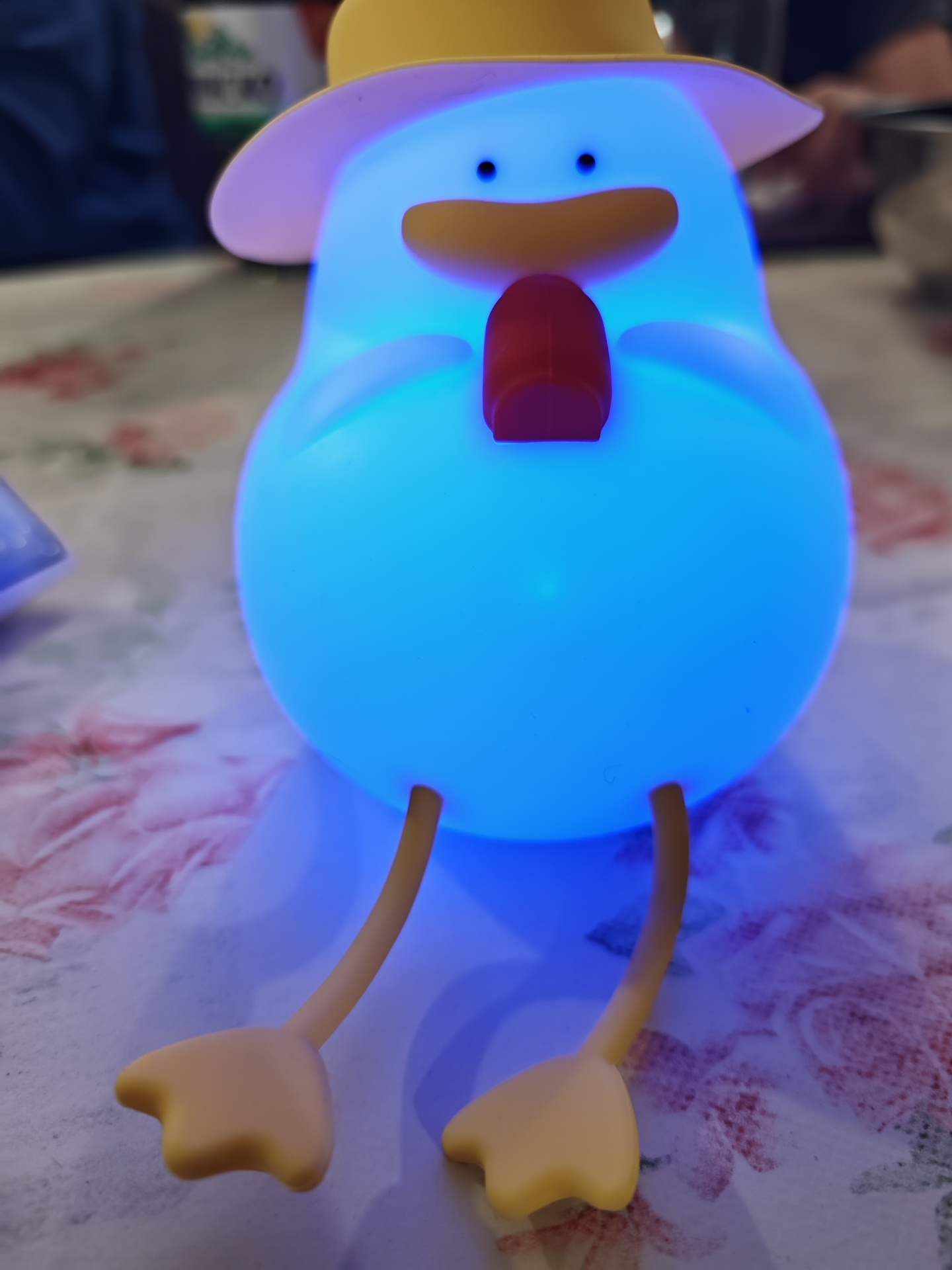 A blue, duck-shaped lamp with a yellow hat and feet is on a table with a floral pattern