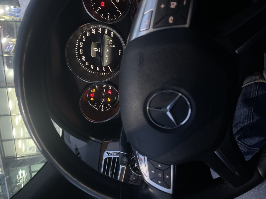 A car's dashboard and steering wheel are visible. The speedometer reads 0 km/h, and the odometer displays -4.0°C. The transmission is in the 'D' position. Several warning lights are illuminated, including those for the tire pressure, engine, and possibly other systems. The fuel gauge appears to be near the half-full mark. The steering wheel is black, featuring a Mercedes-Benz logo in the center. Buttons for various controls are on the wheel. A leg in a denim garment is partly visible on the side.