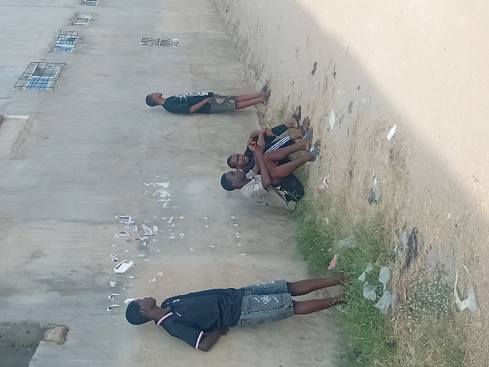 The scene in Awka, Nigeria, depicts four young males situated along an unpainted, light grey concrete wall beside a dirt pathway