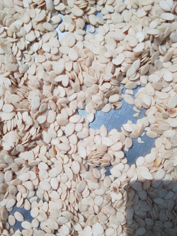 The image displays a dense, top-down view of numerous light-colored, oval-shaped seeds scattered across a reflective metallic surface. The seeds, appearing to be melon or similar variety, are predominantly off-white to pale beige, with occasional darker specks or areas of light browning consistent with drying or roasting. They are irregularly distributed, covering most of the frame, but allowing glimpses of the underlying scratched, gray metallic surface, particularly in the lower central and right portions. No individuals, explicit actions, or interactions are depicted. The environment is an interior setting, likely a food preparation or processing area, situated in the city of Unknown, Unknown.