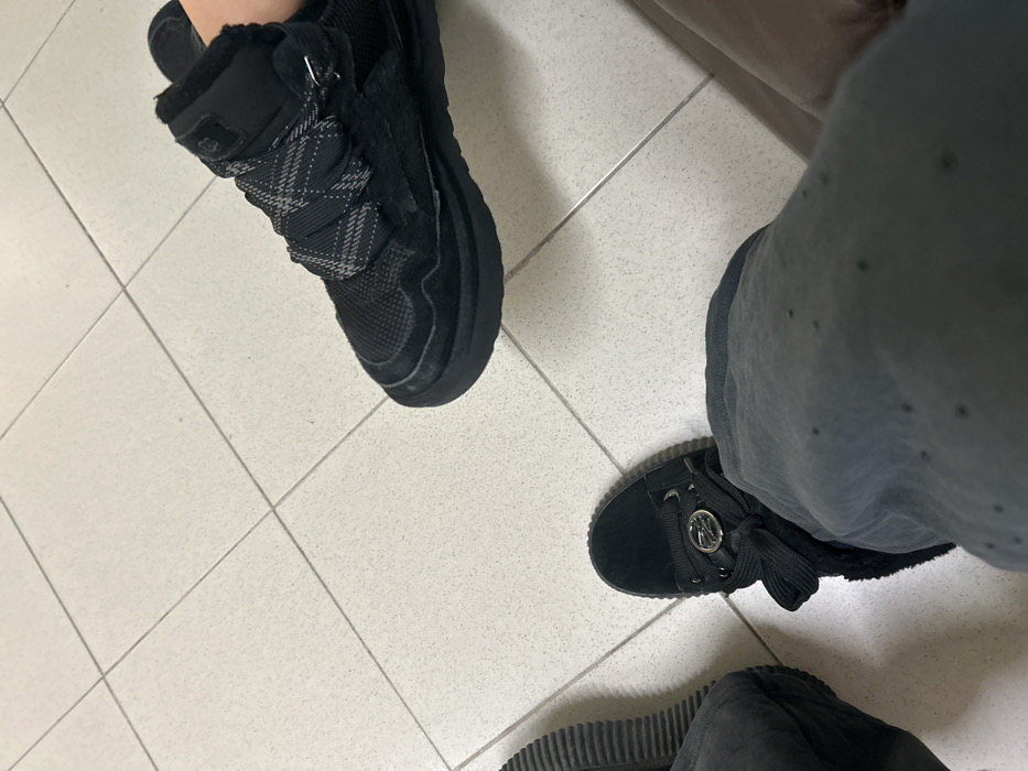 An overhead shot depicts the lower extremities of two individuals on a light-colored tiled floor. The floor consists of off-white square tiles with narrow, light grey grout lines forming a grid pattern. On the lower left, an individual wears dark grey trousers with small, irregularly spaced perforations. On their left foot, a black suede creeper-style shoe is visible, featuring a thick ridged sole, black laces tied in a bow, and a circular silver metallic emblem on the tongue. The emblem appears to bear a stylized letter, possibly "R" or a brand logo. A portion of a similar shoe is visible on the far left. On the upper right, a second individual wears a black mid-top sneaker. This shoe features a combination of black mesh and suede-like material, a thick black sole, and black laces with a grey plaid or checkerboard pattern. A small metallic buckle or strap is present on the lateral side near the ankle, and a dark brand label, possibly "UGG," is affixed to the exterior of the collar. The shoe's interior lining appears to be dark fur or shearling. One person appears to be seated or in a resting position, while the other's shoe is positioned as if slightly elevated or hanging. The scene takes place indoors.