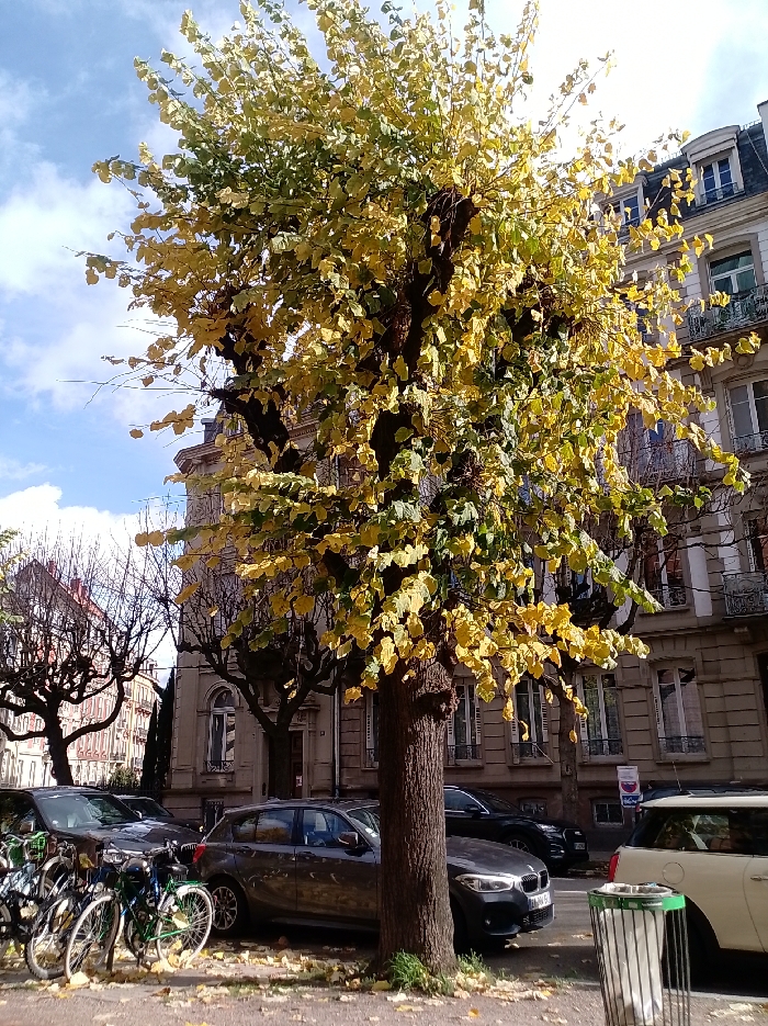 The image depicts an urban street scene in Strasbourg, France, during daytime, likely in autumn due to the foliage. A large, deciduous tree with predominantly yellow and some green leaves stands prominently in the center foreground, its trunk visible at the base. Scattered brown leaves are present on the pavement beneath the tree. To the left of the main tree, a cluster of approximately five bicycles is parked. In the mid-ground, a dark grey hatchback vehicle is parked behind the main tree, followed by a dark SUV. On the far right, a white Mini Cooper is partially visible. Further back and to the left, another tree with bare, gnarled branches is present. The background features several multi-story buildings of European architectural style, characterized by light-colored facades, multiple windows (some with closed shutters), balconies with wrought-iron railings, and mansard roofs with dormer windows. A segment of blue sky with scattered white clouds is visible above the buildings and tree canopy. No individuals are present in the scene. A metal waste bin with a green rim is situated on the far right of the foreground.