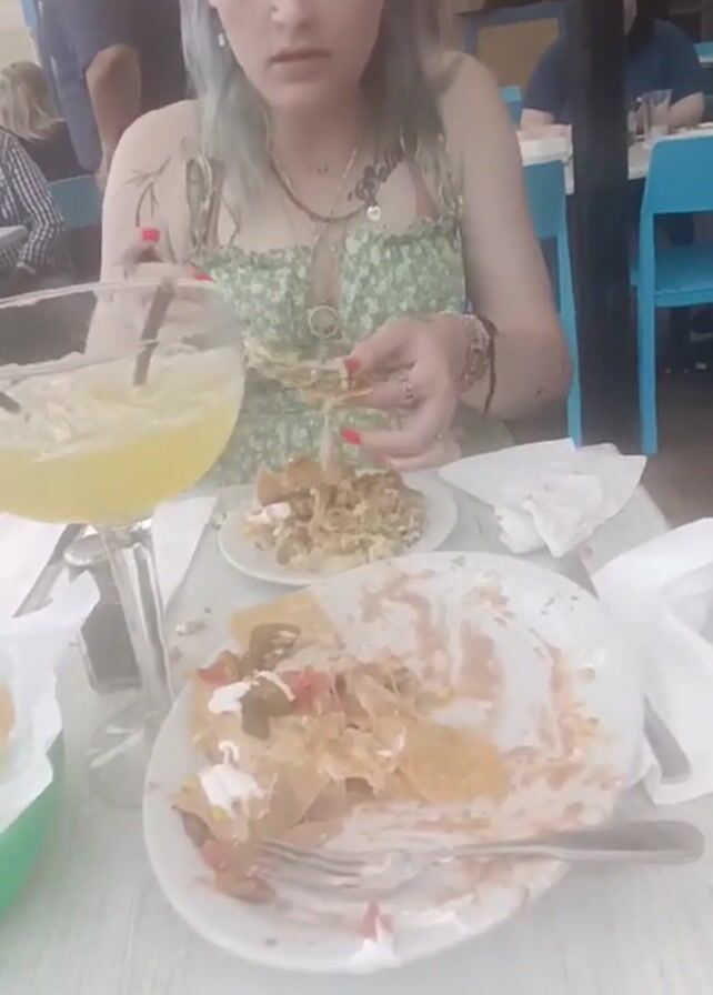 A woman with blue-tinted hair sits at a table on a restaurant patio. She wears a green floral-print sundress and has tattoos on her arm. She is eating nachos with her hands, pulling at melted cheese hanging from a chip. On the table are two plates of nachos, one mostly eaten, as well as a large cocktail glass filled with a yellow drink. A fork lies on the partially eaten plate. A man is standing nearby. The patio is populated with other diners at turquoise tables. The scene is taken in daylight.