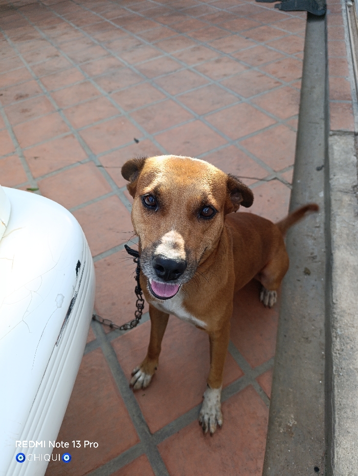 A brown dog with a chain leash stands on a tiled surface next to a white object. The dog has a pink tongue and white markings on its paws. The background shows a concrete curb and additional tiles, suggesting an outdoor setting. A watermark "REDMI Note 13 Pro" and "CHIQUI" is visible in the corner of the image.