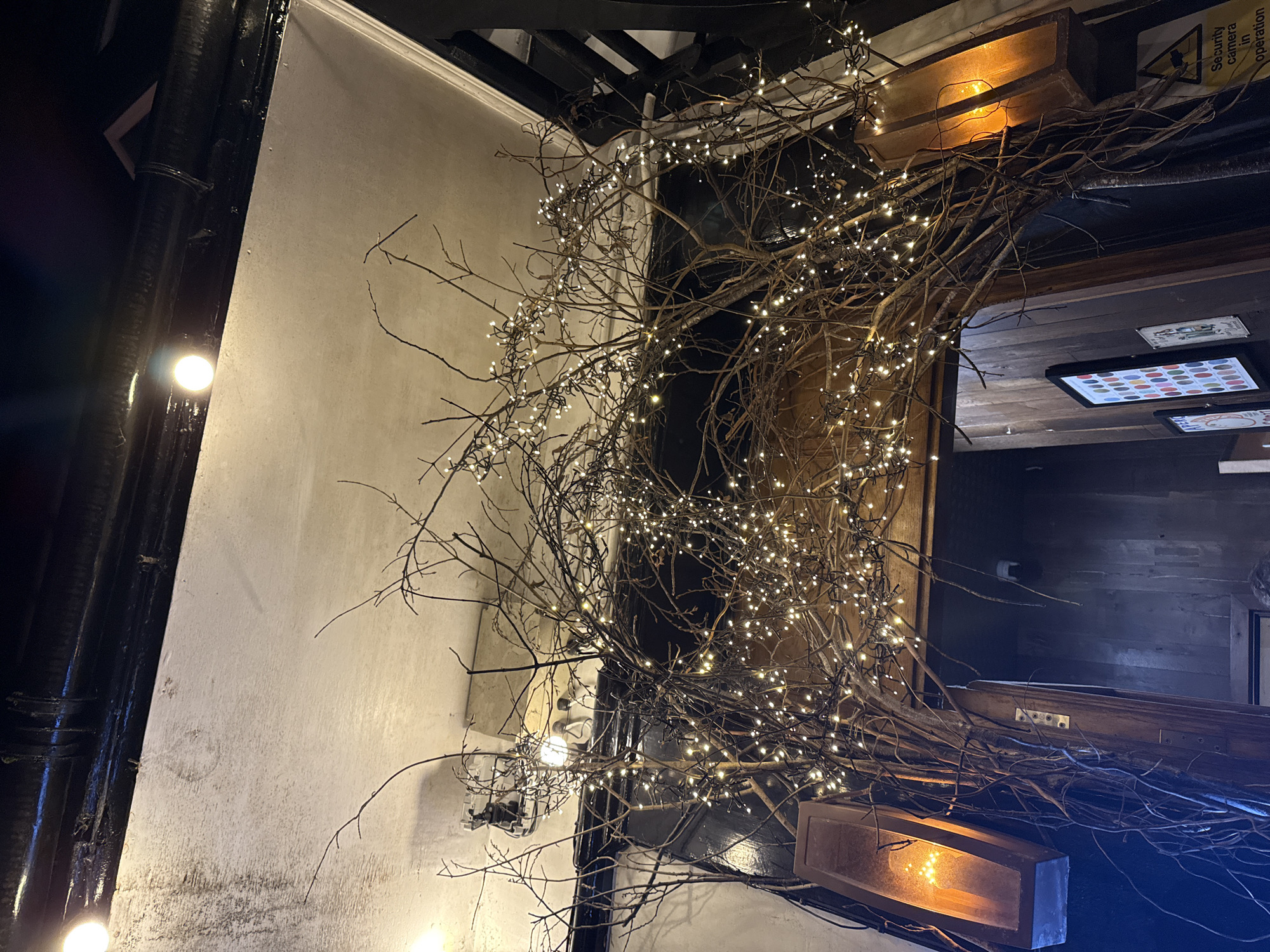 This appears to be an interior shot, possibly of a pub or restaurant in Windermere, UK. The image is taken from a low angle, looking up. A thick, black pipe runs vertically along the left side, with a few small lights attached. The wall is a pale, textured color. In the center is a display of bare branches adorned with small white lights, creating a visually prominent feature. This branch arrangement partially obscures a dark opening or doorway. Above the doorway, there's a wooden structure with what looks like signage. To the right of the doorway, one can see a glimpse into another room with a dark wooden wall, a few pictures, and a lighting fixture. The overall impression is of a cozy, dimly lit space with rustic decor.