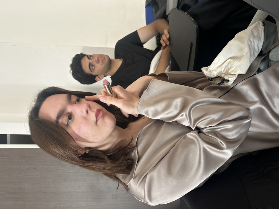 The image depicts an indoor scene within what appears to be a classroom or lecture hall, potentially located in Paris, France. In the foreground, a young adult female with shoulder-length medium-brown hair and small gold hoop earrings is applying a light pink lipstick from a golden tube to her lips. She wears a light beige satin-like long-sleeved shirt, and her right index finger is positioned near her right eye, touching her cheek. In the background, seated slightly behind and to the right, a young adult male with dark, curly hair and a black t-shirt is looking towards the right side of the frame, his hands resting on a dark, flat desk surface. A crumpled white fabric item rests on the female's lap area, partially obscuring a dark electronic device. The background consists of a plain light-colored wall and a section of light-colored wooden paneling on the left.