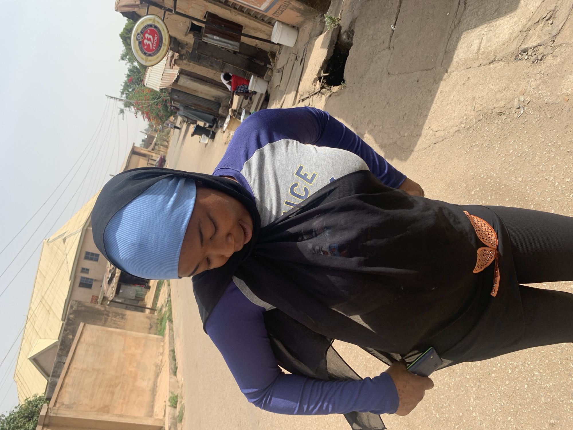 The image depicts a female subject standing on a dusty, light brown road in Jos, Nigeria, under bright daylight. The subject, of dark complexion, wears a light blue ribbed cap beneath a black headscarf. Her attire includes a long-sleeved shirt with blue sleeves and a grey torso featuring "UNICE" in yellow lettering, paired with black trousers or leggings. An orange, possibly metallic, decorative accessory shaped like a butterfly or tail fin is affixed to her lower back. She holds a dark-colored smartphone in her right hand, positioned near her hip, and her gaze is directed downwards. The environment shows a typical urban or semi-urban street scene. To the left, a light brown plastered wall stands beside a building with a light-colored gabled roof. To the right, a series of structures, some constructed with corrugated metal sheets and others with faded, rendered walls, line the road. An oval "33" Export beer sign, white with red text, is prominently displayed on the right. Overhead power lines traverse the scene against a hazy, pale sky. Further down the street, a figure in a light-colored garment stands near a black bin and white buckets. Beyond them, another individual in a red shirt is partially visible, bent over near more white buckets. An exposed, open drainage channel is present along the right edge of the dusty road, with visible cracks and uneven concrete sections. Shadows indicate high sun exposure.