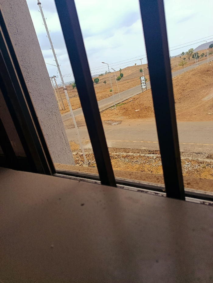 A view from an interior space looks out through a window with four dark, vertical security bars. The scene, located in Rafin Pa, Nigeria, depicts an expansive, dry landscape under an overcast sky. A two-lane paved road, likely asphalt, traverses the midground, sloping gently uphill and curving towards the right. The surrounding terrain is characterized by reddish-brown earth with sparse, dry, yellowish vegetation. Along the left side of the road, multiple utility poles with overhead lines are visible. Streetlights, identifiable by their pole-mounted fixtures and attached solar panels, are spaced intermittently along both sides of the road. Further along the road on the right, a prominent white sign structure composed of stacked rectangular panels stands beside the thoroughfare. In the background, dry, undulating hills rise under a uniformly cloudy sky. No individuals, vehicles, or active movement are visible within the frame.
