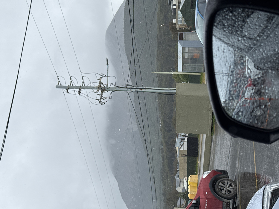 A cloudy day shows a telephone pole with multiple wires extending across the frame. Behind it, a mountain fades into the misty sky. In the foreground, part of a red car is visible on the wet pavement. A side mirror, covered in raindrops, reflects the red car and other blurry objects. The perspective suggests the photo was taken from inside another vehicle.