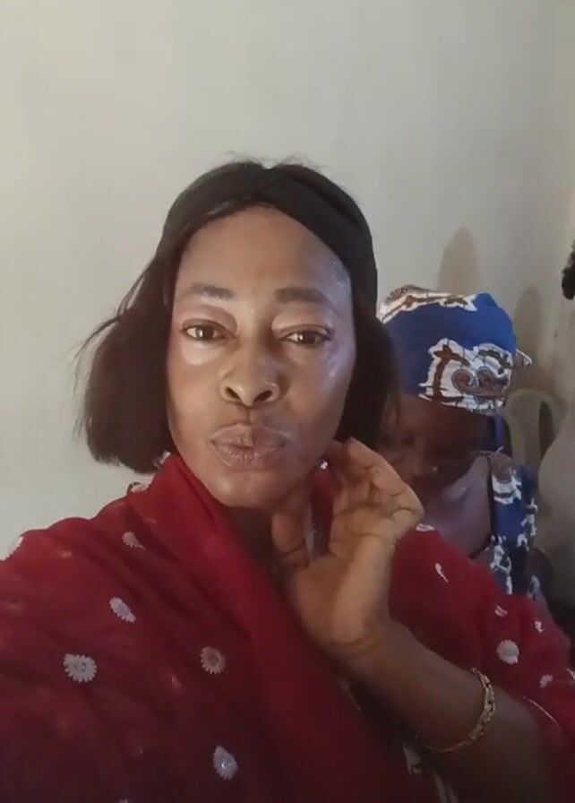 A woman in a red shawl, dark hair with a black headband, and a gold bracelet is the central focus, appearing to take a selfie video. She smiles, makes a kissy face, and then waves. Behind her, another woman wearing a blue head covering is visible. The background is a plain, light-colored wall and a few chairs.