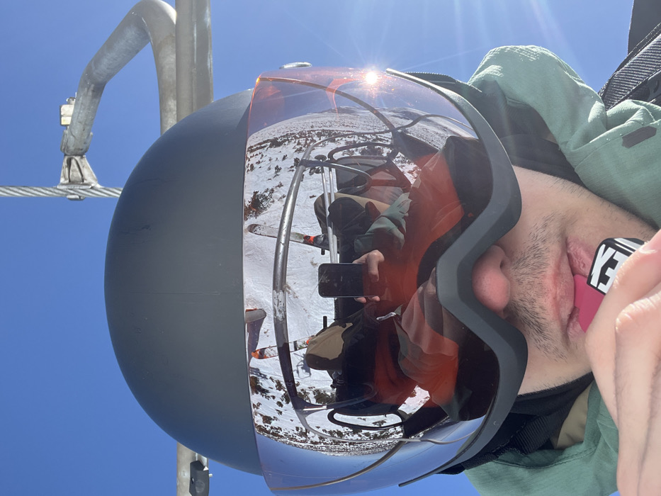 - "An individual, likely male, is depicted from a low angle, wearing a matte black ski helmet, reflective orange-tinted ski goggles, and a green ski jacket" by FM-H3Lpa2, licensed under CC BY 4.0