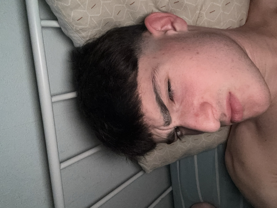 A person rests on a pillow with light geometric designs. The individual's dark hair contrasts with their fair skin. Their eyes are closed. The person's face is illuminated, highlighting details like eyelashes and skin texture. Beside them, a white metal bed frame is visible against a light blue wall. A striped blanket is seen beneath the pillow.