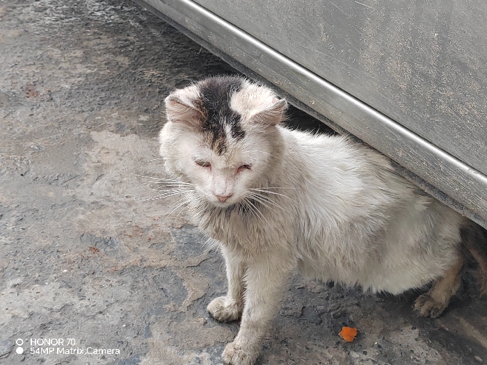 A thin, white cat with black spots on its head and discolored fur stands partially under a metal object, possibly a car. The cat appears sickly or aged, with squinted eyes. Its fur is matted and dirty. The cat is standing on a textured surface that appears to be concrete. An orange object is visible near the cat's hind legs on the ground. The image was taken with an HONOR 70 54MP Matrix Camera.