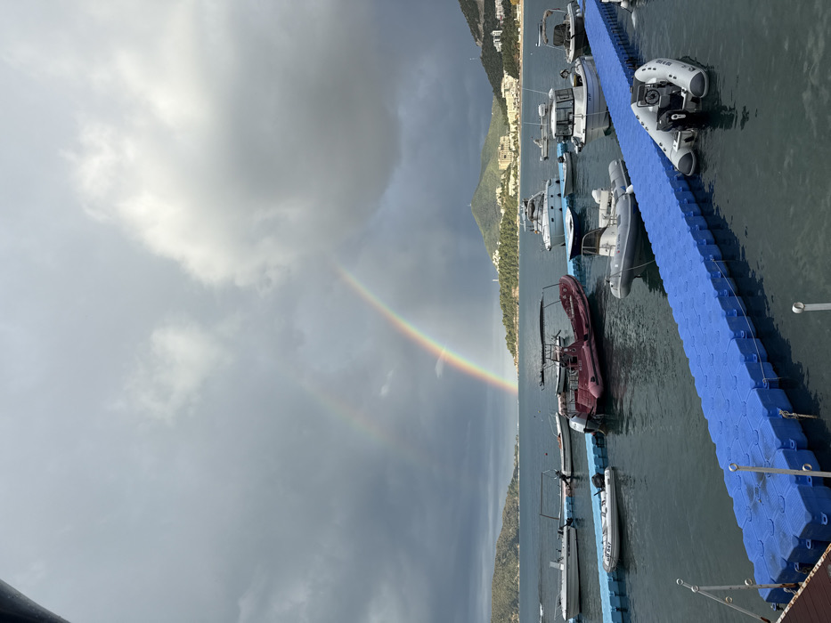 This image depicts a coastal scene in Budva, Montenegro, likely within or overlooking the Budva Marina or a nearby bay, with the Budva coastline and hills visible in the background. The sky is dominated by dark grey, heavy storm clouds, particularly on the left and upper sections, transitioning to lighter grey and white clouds towards the upper right. A prominent double rainbow arches across the center of the frame, with its base seemingly touching the water and distant land on the left. The primary rainbow is vivid, exhibiting a full spectrum of colors, while a fainter secondary rainbow is visible above it. The foreground and midground feature calm, dark blue-green water, reflecting the overcast sky. A blue modular floating dock system extends from the lower left, forming a walkway. Numerous boats of various types are moored or anchored in the bay around this dock. These include several white inflatable boats with outboard motors, a distinctive large dark red rigid-hulled inflatable boat (RIB) with a white outboard motor, and multiple white cabin cruisers, some with canopies. In the background, a hilly coastline is visible. To the left, a green, forested landmass, possibly Sveti Nikola island or a peninsula. To the right, green hills are dotted with numerous white and light-colored buildings, indicating residential or resort development along the Budva shoreline. No individuals are visible anywhere in the scene. The lighting suggests conditions immediately following a rain shower, with partial sunlight breaking through the clouds.
