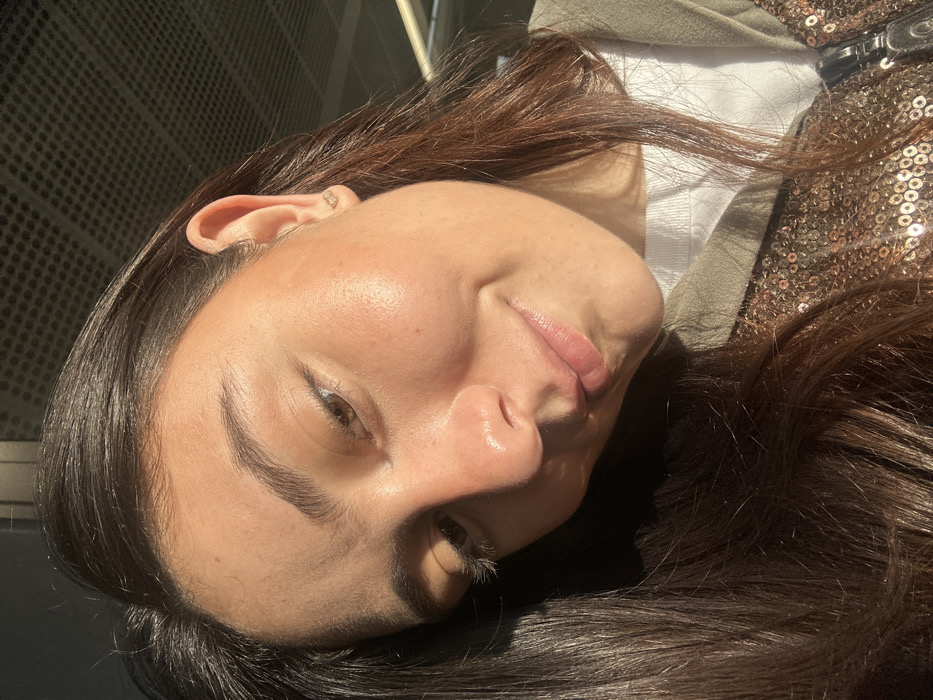 A close-up, angled portrait of a female individual is depicted, captured in the city of Paray-Vieille-Poste, France. The subject, appearing to be in her mid-20s to early 30s, has long, dark brown hair that falls over her shoulders and partially obscures her left side. Her complexion is light-to-medium, with prominent highlights on her right cheek, nose, and forehead, indicating strong, directional lighting from the upper left. Her eyes are dark, and she exhibits a subtle, closed-mouth smile with a slight downward gaze. A small, light-colored stud earring is visible in her right earlobe. She is dressed in a white crew-neck t-shirt, covered by an olive-green or khaki collared jacket. Below this, a garment adorned with numerous small, reflective, rose-gold or copper-toned sequins is partially visible, with a black zipper pull on its right side. The background is dark and out of focus, revealing a faint, grid-like architectural structure in the upper right portion of the frame.