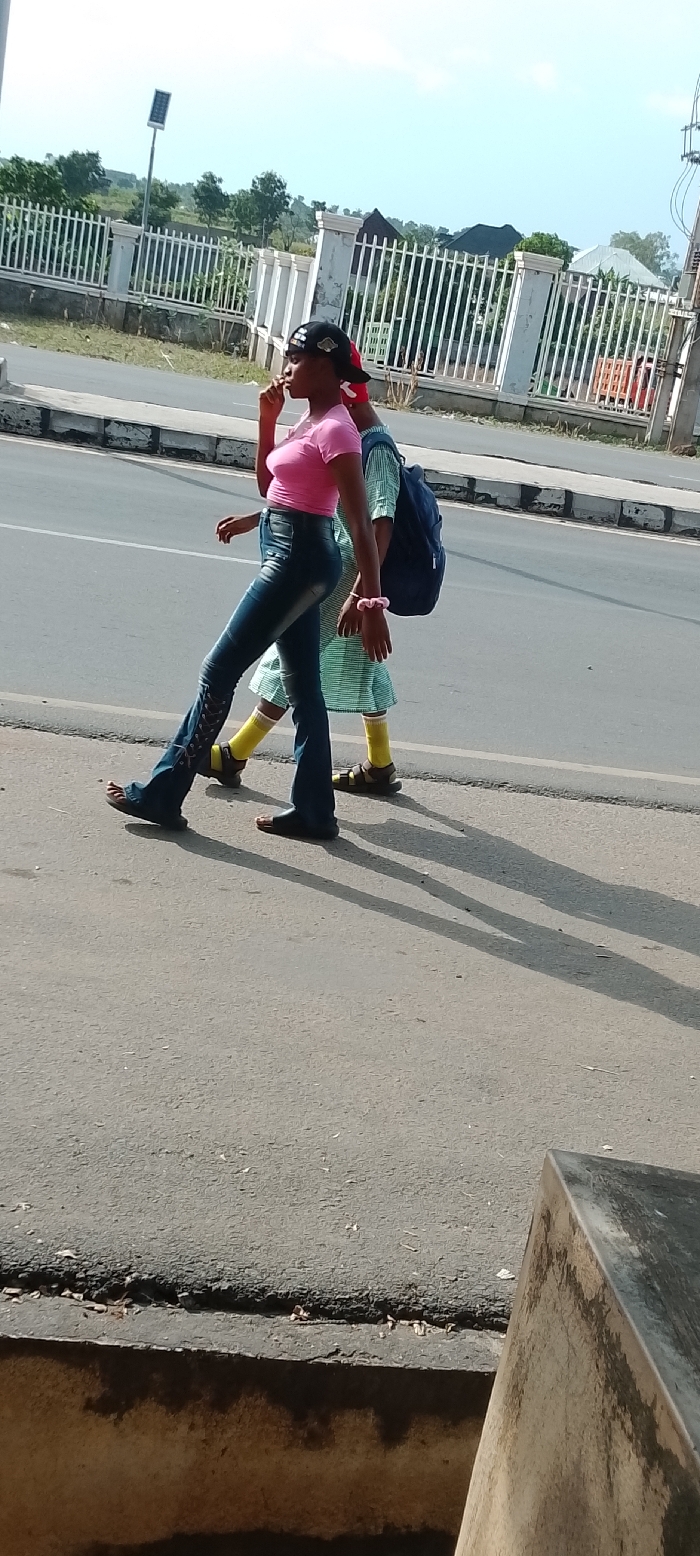 Two individuals are observed walking from left to right on a paved shoulder adjacent to an asphalt road under a clear sky in Lokoja, Nigeria. The foreground individual, appearing female, wears a pink short-sleeved top, dark-colored flared jeans with visible lacing detail on the outer thighs, and black sandals. A black baseball cap with white lettering is worn backward, and a pink scrunchie is on her left wrist. Her right hand is positioned near her chin. The second individual, partially obscured behind the first, also appearing female, wears a light green and white striped long-sleeved garment, yellow socks, and dark sandals. She carries a dark blue backpack. A red head covering is visible. To the left of the road, a concrete curb separates the paved shoulder from the main road. Across the road, a white vertical bar fence with substantial concrete pillars delineates a property. Beyond the fence, green vegetation, including trees and shrubs, is present, with some distant structures featuring dark roofs visible. A pole with a solar panel attached is also visible beyond the fence. Long shadows from the individuals are cast on the paved surface, indicating direct sunlight from the upper left. The overall scene depicts a sunny outdoor environment.