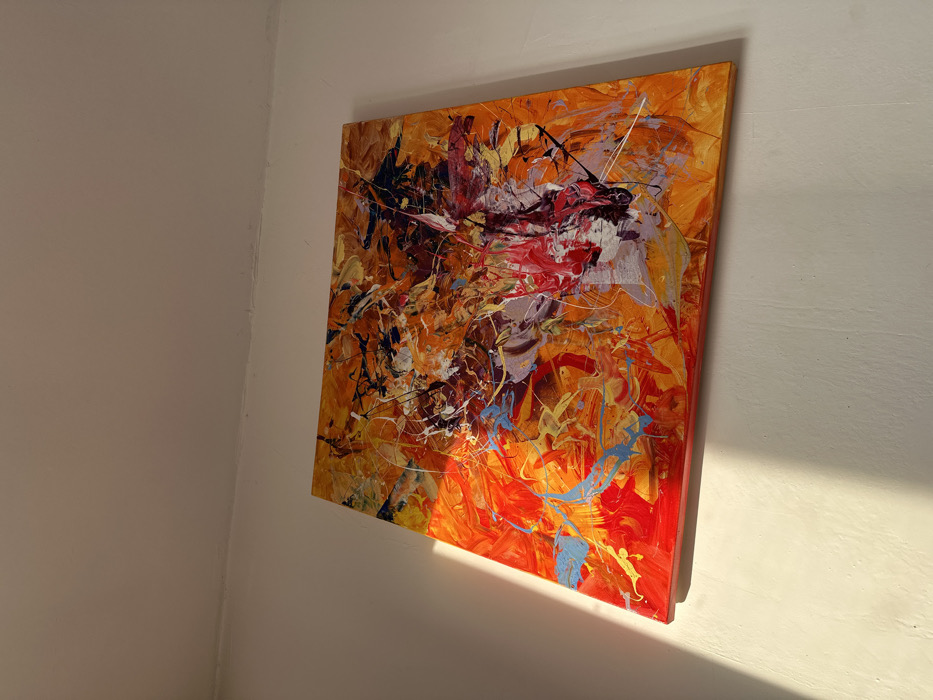An abstract painting, dominated by warm tones of orange, red, and yellow, hangs on a white wall